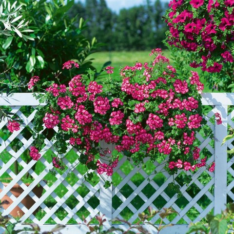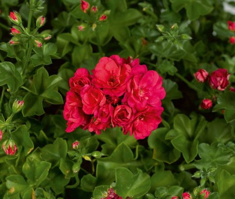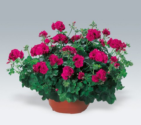 Cette espèce aux longs et souples rameaux retombants, au feuillage petit et luisant, trouve son emploi cultivée en pots et jardinières, dans la décoration des fenêtres, balustrades... Elle est appréciée pour sa parfaite résistance à la chaleur et à la sécheresse ainsi que sa grande floribondité. La fleur est double. Ce géranium produit moins de fleurs que le lierre simple, mais celles-ci sont plus grosses.